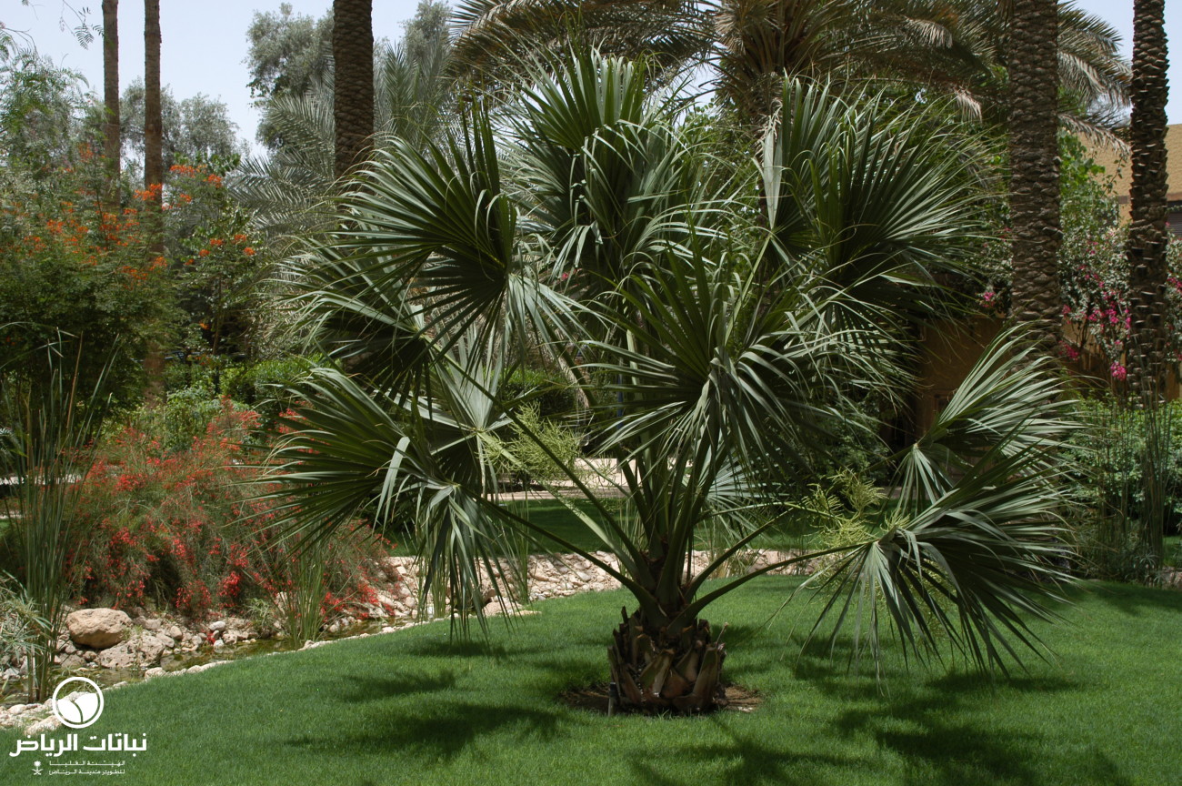 موطنه الأصلي فلوريدا. وهو نبات حسن المظهر ويمكن أن ينمو جيداً في حدائق مدينة الرياض. والساق رمادية اللون والجزء الأسفل منها أملس بينما الجزء الأعلى مغطى ببقايا قواعد الأوراق القديمة مرتبة بصورة متقاطعة. ولا يوجد عمود للتاج وتخرج الأوراق الكبيرة من الساق مباشرة منتشرة في الاتجاهات جميعها. وينمو هذا النخيل حتى ارتفاع 15-20 متراً وله تاج مستدير يبلغ قطره 4-5 أمتار. والأوراق مروحية قوية ذات نصل ناصع الخضرة إلى زيتوني اللون قطره 2-3 أمتار. وعنق الورقة عديم الأشواك ويمتد حتى نهاية نصل الورقة. وقمم الوريقات منشقة وبها ألياف على الحواف. وتحمل الأزهار في شكل مجموعات على حوامل متفرعة متدلية. والأزهار صغيرة كريمية بيضاء ذات رائحة تظهر في الصيف. والثمار صغيرة مستديرة سوداء اللون عند نضجها. والبرعم القمي الغض الذي يوجد داخل التاج يؤكل مثل القرنبيط. وهذا النبات متأقلم مع كل أنواع التربة الرطبة جيدة الصرف. وهذا النبات يلائمه ضوء الشمس الكامل إلى الظل الخفيف والذي يزيد من حجم التاج. وهذا النبات له مقدرة على تحمل الجفاف والجو البارد ومقاوم للصقيع حتى – 10 مْ . كما أنه مقاوم للرياح. وله مجموع جذري قوي عميق ويتطلب الري المنتظم. والإكثار يتم عن طريق البذور. ومناسب لتزيين الطرق والمسطحات الخضراء. وهو نبات سهل الرعاية وحاجته إلى الصيانة قليلة.